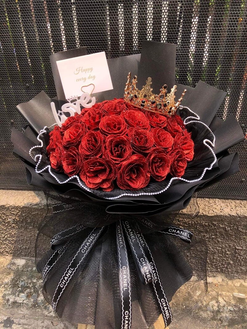 Hoa hồng nhũ kim tuyến màu đỏ thường được phối với giấy màu đen mang lại vẻ đẹp quý phái và sang trọng.