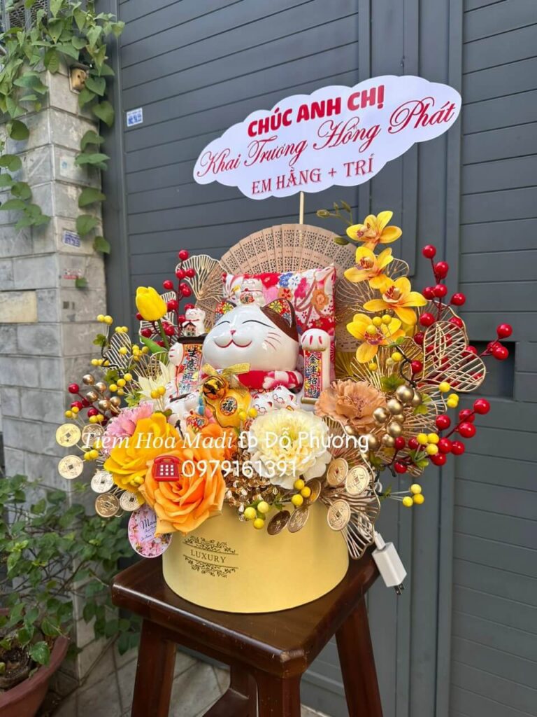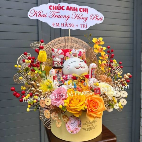Quà Khai Trương Cho Người Tuổi Sửu có thể là những vật phẩm trang trí như Hộp hoa mèo thần tài mang ý nghĩa phong thủy tích cực.